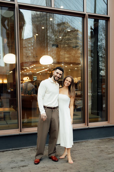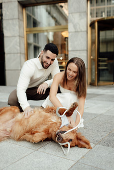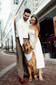 Of course, the session wouldn’t have been complete without their adorable pup, Mr. Cooper. He trotted proudly through the city streets, clearly living his best life and soaking up all the attention.